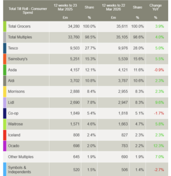 Take-home sales at the grocers increased by 4.4% in the four weeks to 22 March 2026 compared with the same period last year according to latest data from Worldpanel by Numerator.