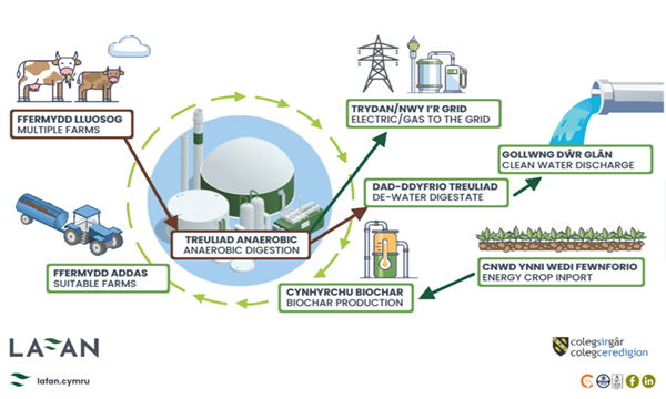 Led by Lafan CYF with Coleg Sir Gâr / Coleg Ceredigion, this project focuses on sustainable utilisation of livestock slurry for renewable energy generation and nutrient management.